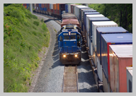 Trains may haul bulk material, intermodal containers, general freight or specialized freight in purpose-designed cars. Rail freight practices and economics vary by country and region.